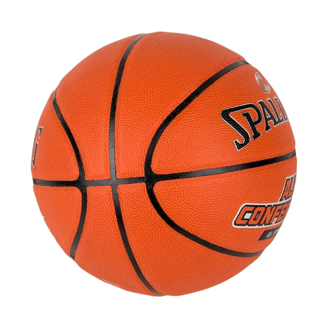 El baloncesto es un deporte que siempre se juega en la cancha. El balón de baloncesto para interior y exterior All Conference de Spalding tiene una cubierta duradera que se puede usar en cualquier superficie de cancha. Está completamente granulado para un agarre firme.